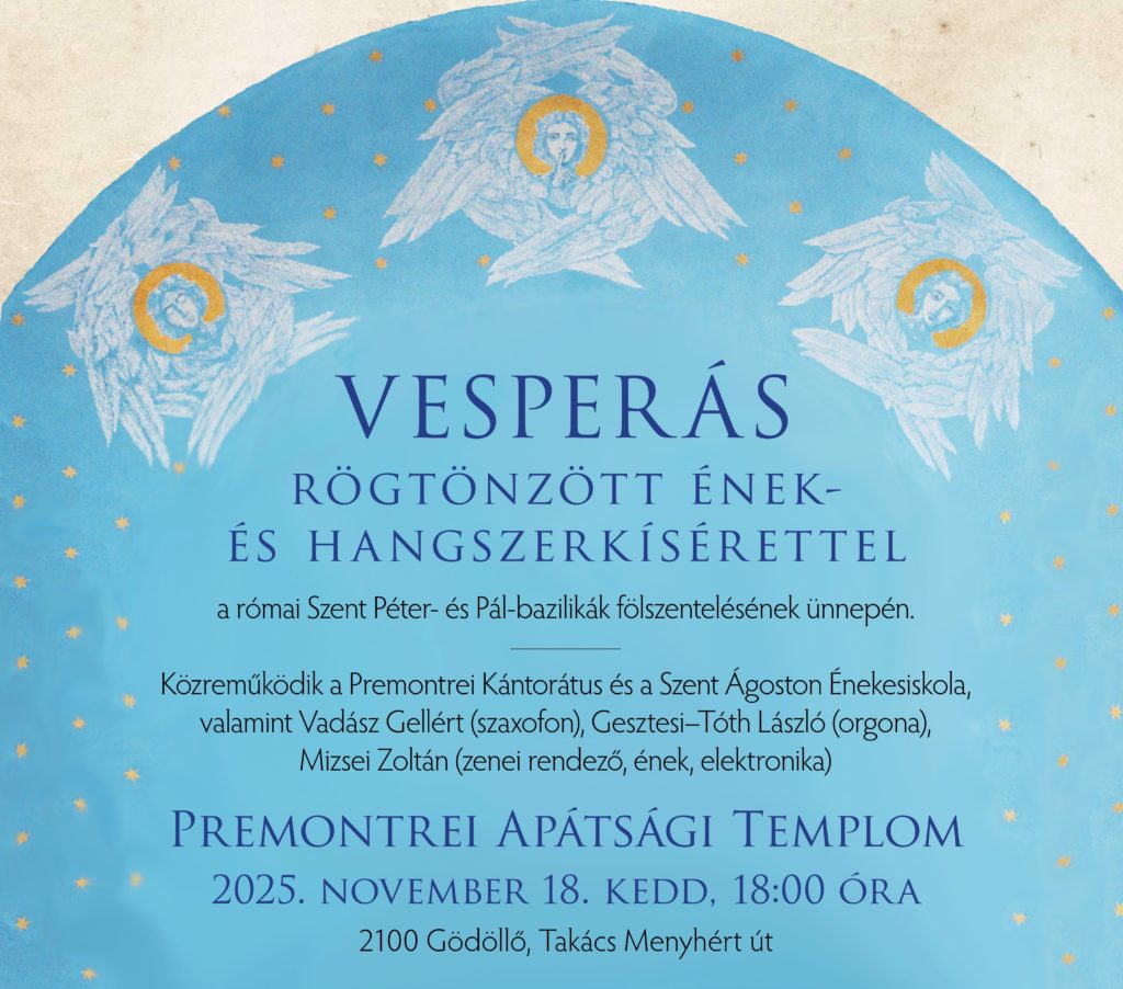 - Kedden este 6-kor a Premontrei Kántorátus és a Szent Ágoston Énekesiskola közreműködésével vesperás lesz rögtönzött ének- és hangszerkísérettel.