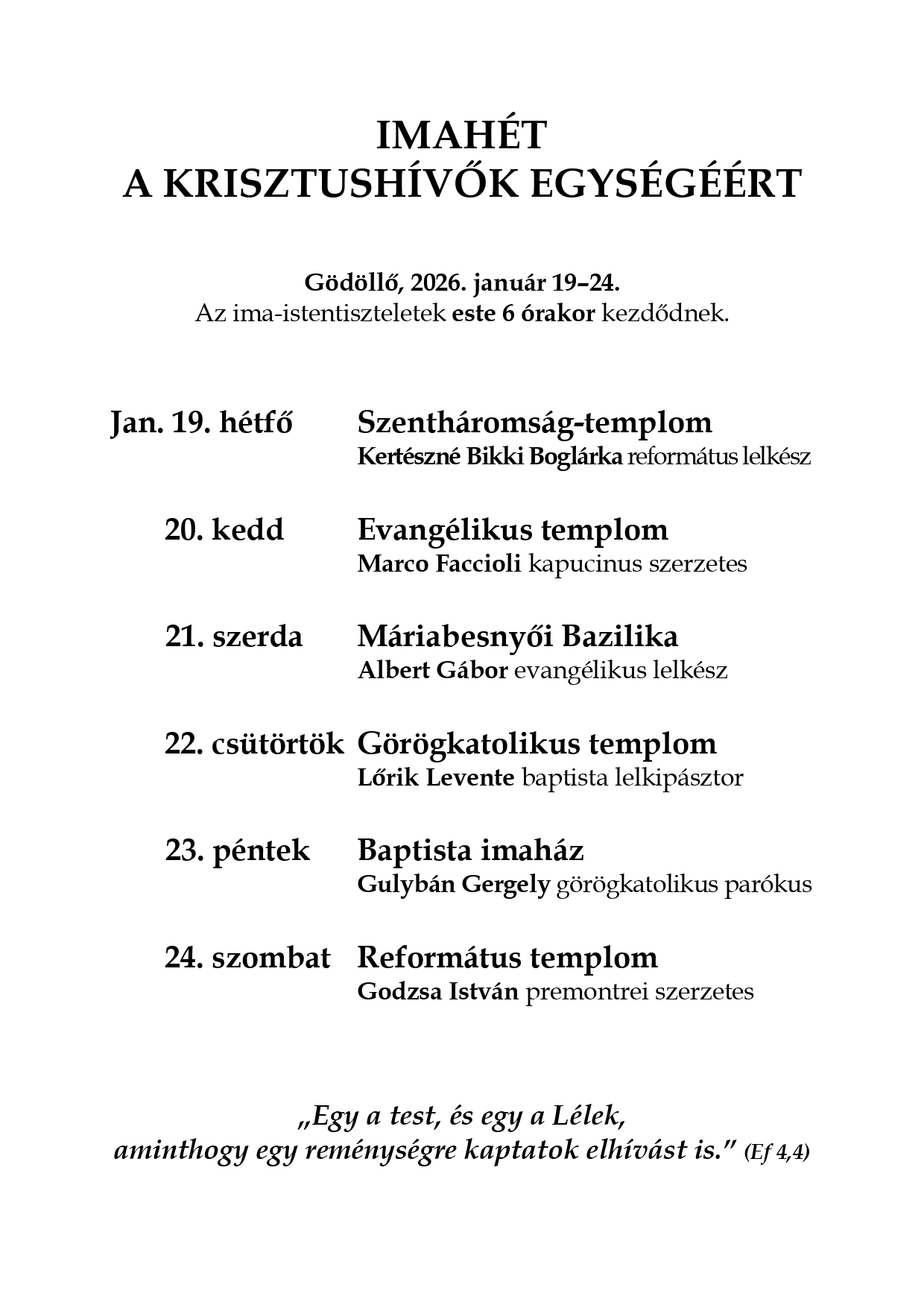 • Az ökumenikus imahét a keresztények egységéért Gödöllőn január 19. és 24. között lesz megtartva. A gödöllői templomokban hétfőtől szombatig lesznek imádságos alkalmak. Apátsági templomunk, mint helyszín, idén kimarad, a kántorátus Máriabesnyőn szerdán este fog énekelni. Szombaton, a záró alkalmon István atya fog prédikálni a református templomban. Részletes program a hirdetőn olvasható, és elküldjük a levelező listára is.