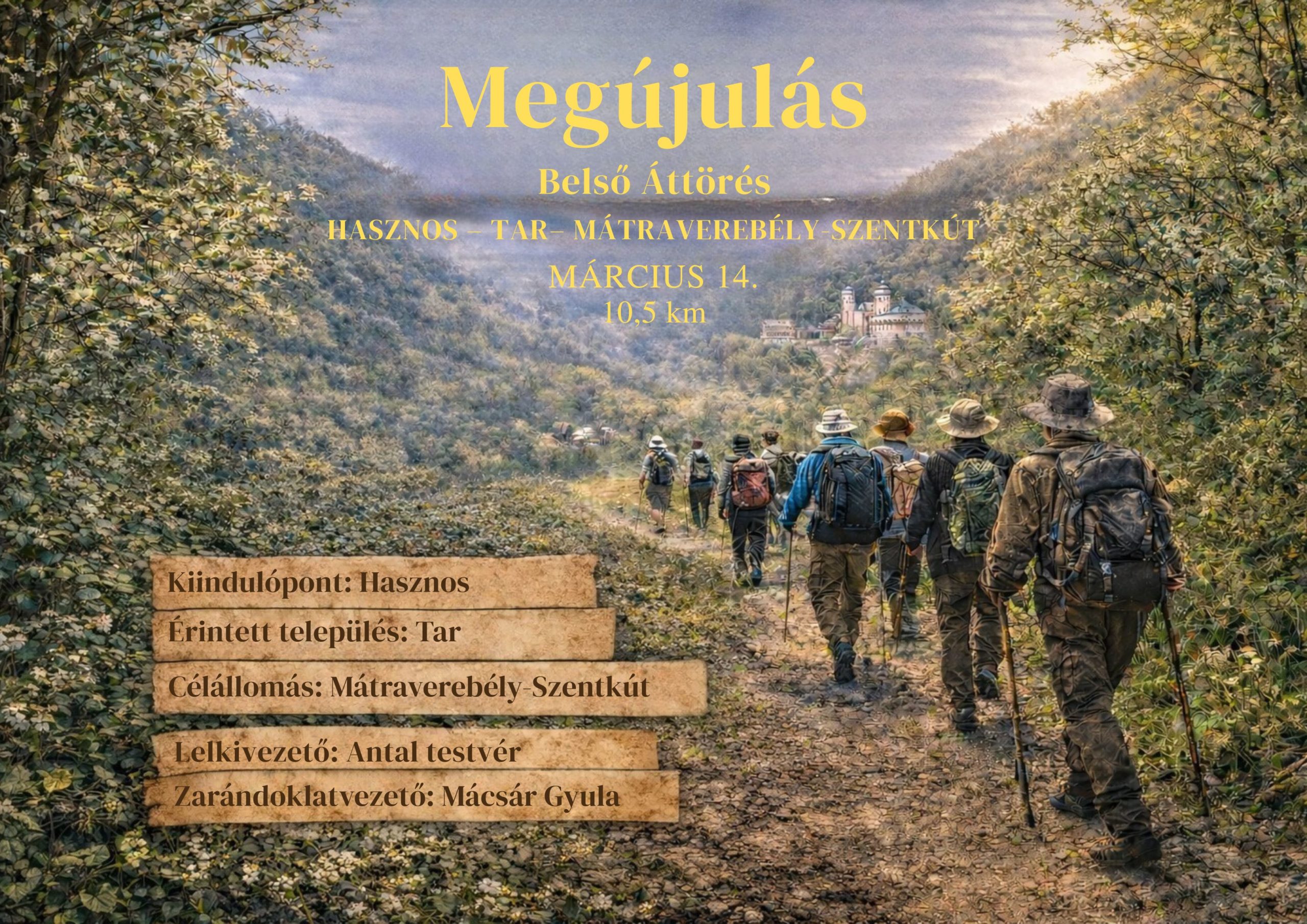 • Tavaszi zarándoklatot hirdetünk Hasznos–Tar–Mátraverebély-Szentkút útvonalon (kb. 10 km) „Megújulás – Belső Áttörés” címmel március 14-én, szombaton Antal testvér és Mácsár Gyula tanár úr vezetésével. Jelentkezni interneten lehet és a kihelyezett íveken.