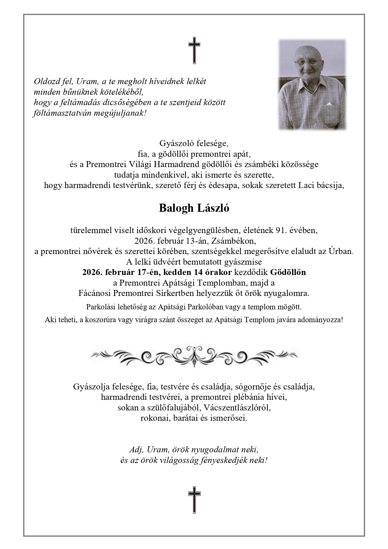 • Kedden du. 2 órakor gyászmise kezdődik, majd Balogh László harmadrendi testvérünk és korábbi plébániai hívünk temetése lesz a szomszédos sírkertben.