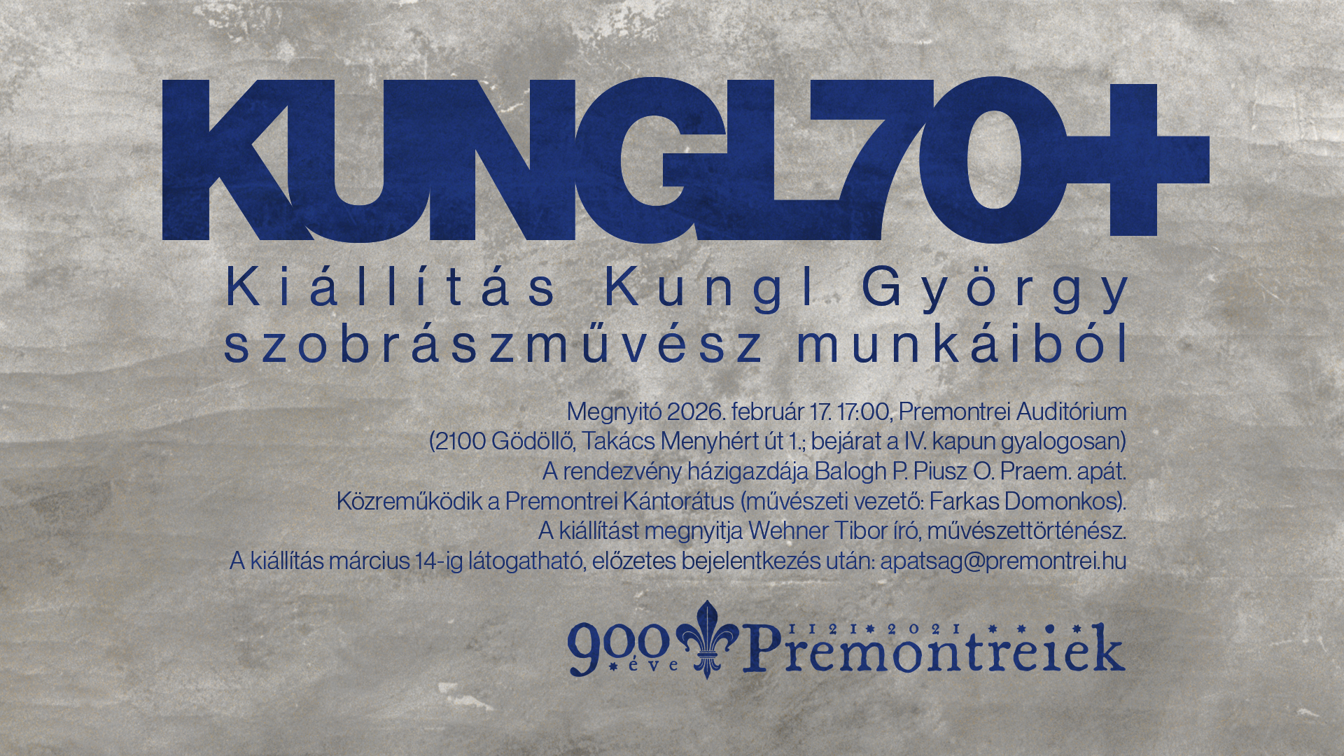 • Kedden du. 5 órakor a Premontrei Auditórium galériáján Kungl György szobrászművész, zsámbéki iskolánk egykori, elhunyt igazgatójának munkáiból nyílik kiállítás, mely eseményre mindenkit nagy szeretettel várunk. Közreműködik a Premontrei Kántorátus.