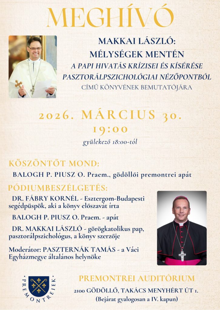 • Március 30-án 19 órakor a Premontrei Auditóriumban Makkai László, görögkatolikus pap, pasztorálpszichológus könyvbemutatója lesz. Vendégünk lesz Fábry Kornél Esztergom-Budapesti segédpüspök is, aki a könyv előszavát írta.