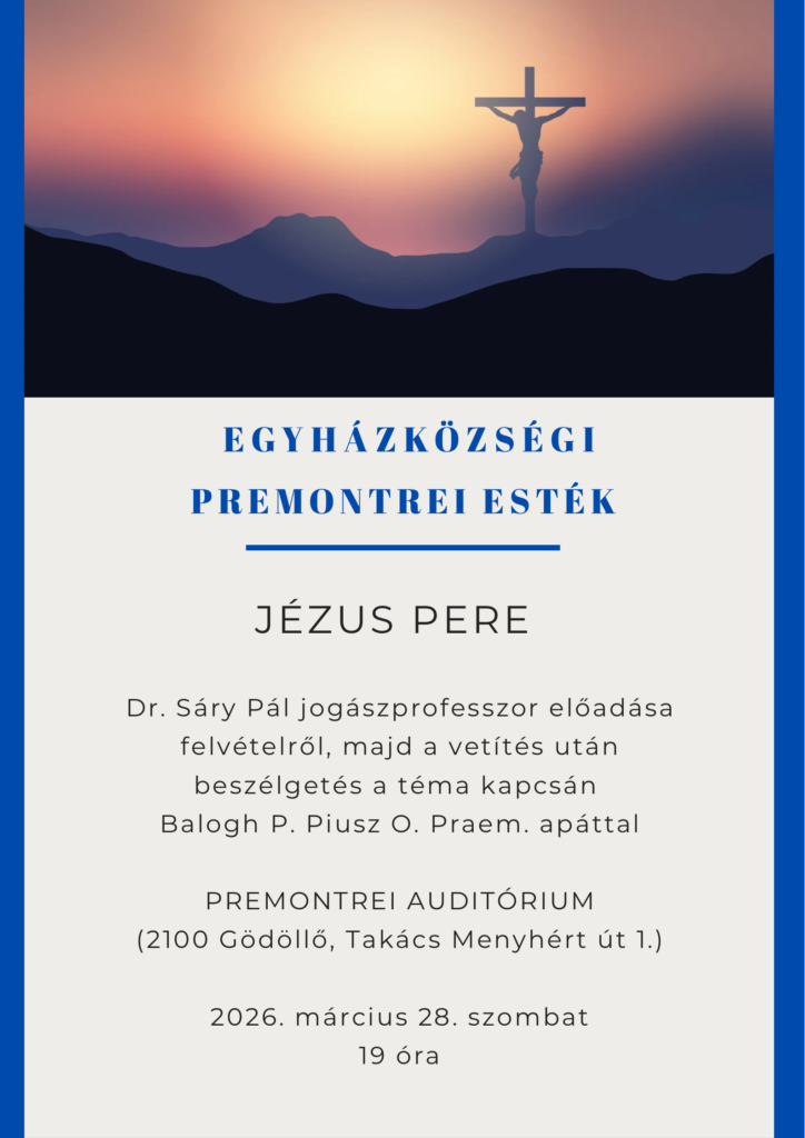 • Március 28-án, szombaton este 7 órakor az Auditóriumban az Egyházközségi Premontrei Esték keretében Dr. Sáry Pál jogász professzor előadását tekintjük meg „Jézus pere” címmel. Utána beszélgetés lesz a nagyheti témáról. Szeretettel várunk és hívunk mindenkit.